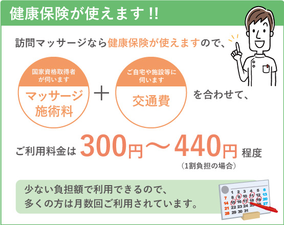 訪問マッサージ「エイト治療院」は健康保険が利用できるので、一部負担の少ない費用でご利用頂けます!