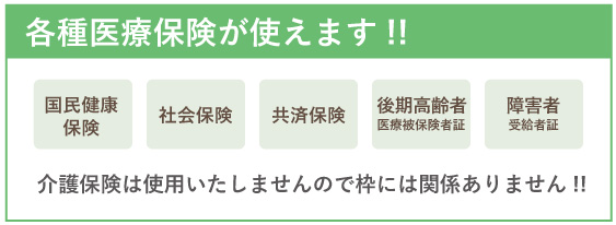 75歳以上の方は後期高齢者受給者証(1割負担)、75歳未満の方は国民健康保険(3割負担)や組合保険など、お手持ちの健康保険がお使いになれます。